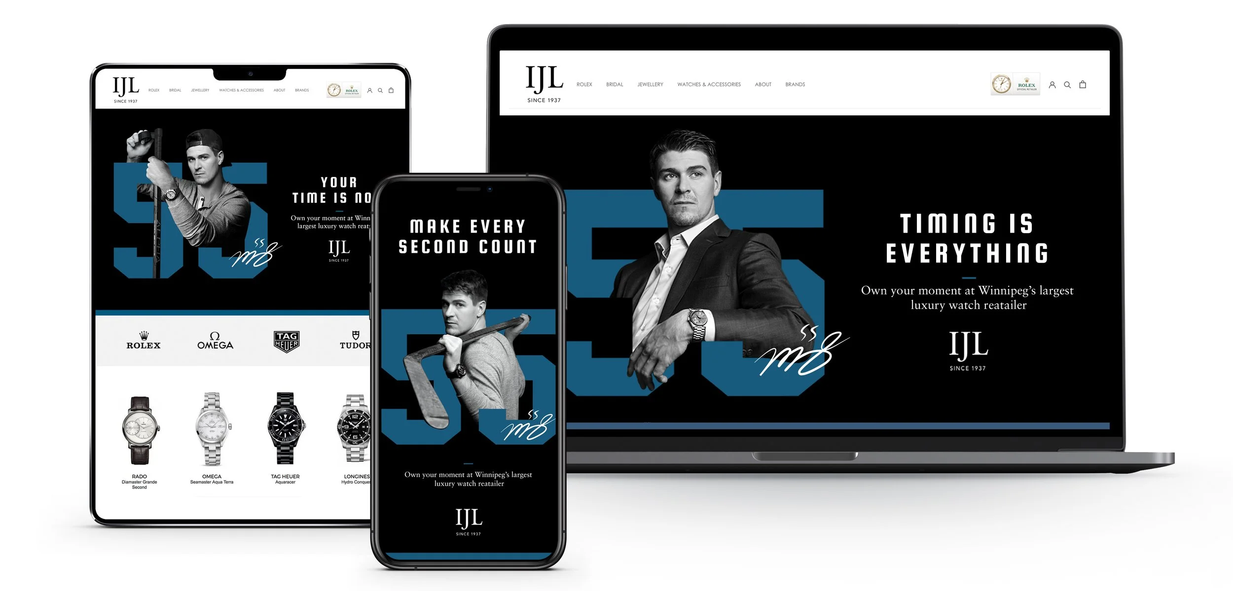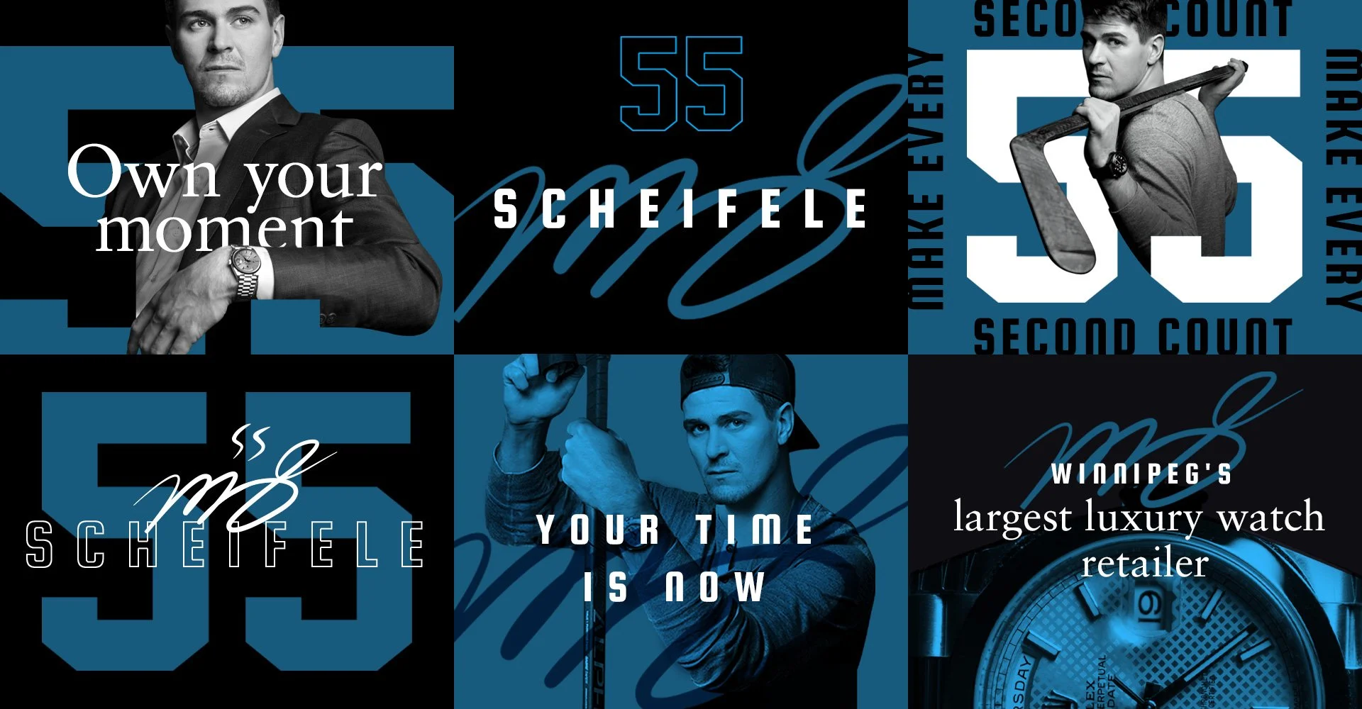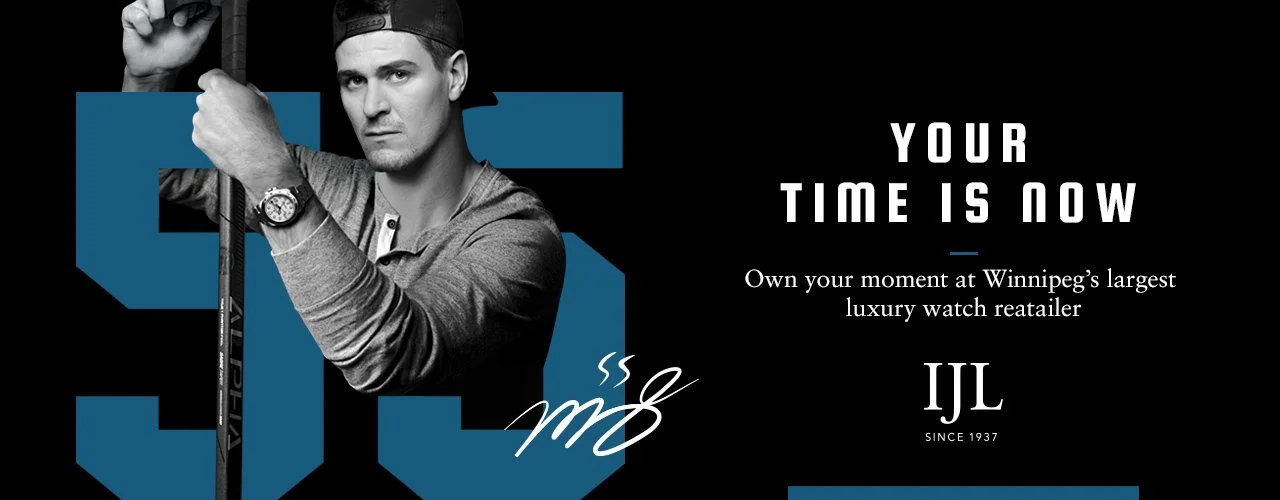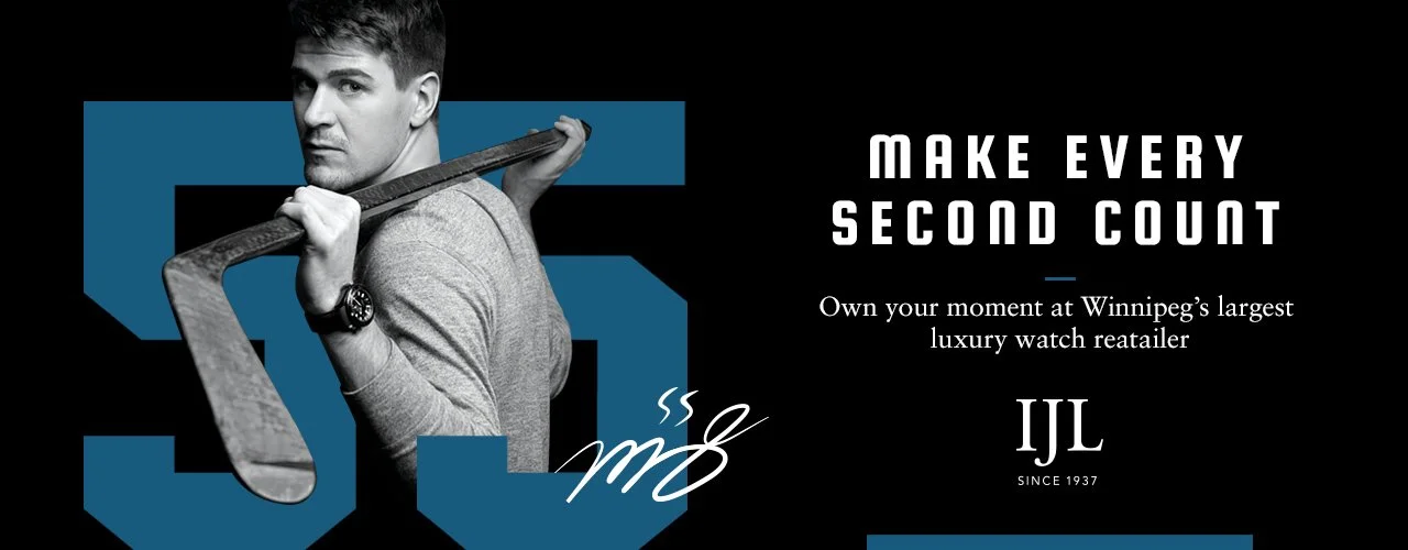 In this Camapign, new markets were targeted through a brand ambassador campaign featuring Mark Scheifele. With the Winnipeg Jets centreman signing a multi-year contract and building his legacy in the city, there was a perfect tie-in with IJL’s established local brand. Communicated through outdoor, point-of-sale print and display ads, the series helped expose the brand, and IJL’s collection of luxury watches, to a larger audience. The design employed masculine fonts as well as Mark’s signature #55 jersey number to offset the original black and white photography. In place of IJL’s primary teal colour, a steel blue was introduced as a nod to the Winnipeg Jets organization.
