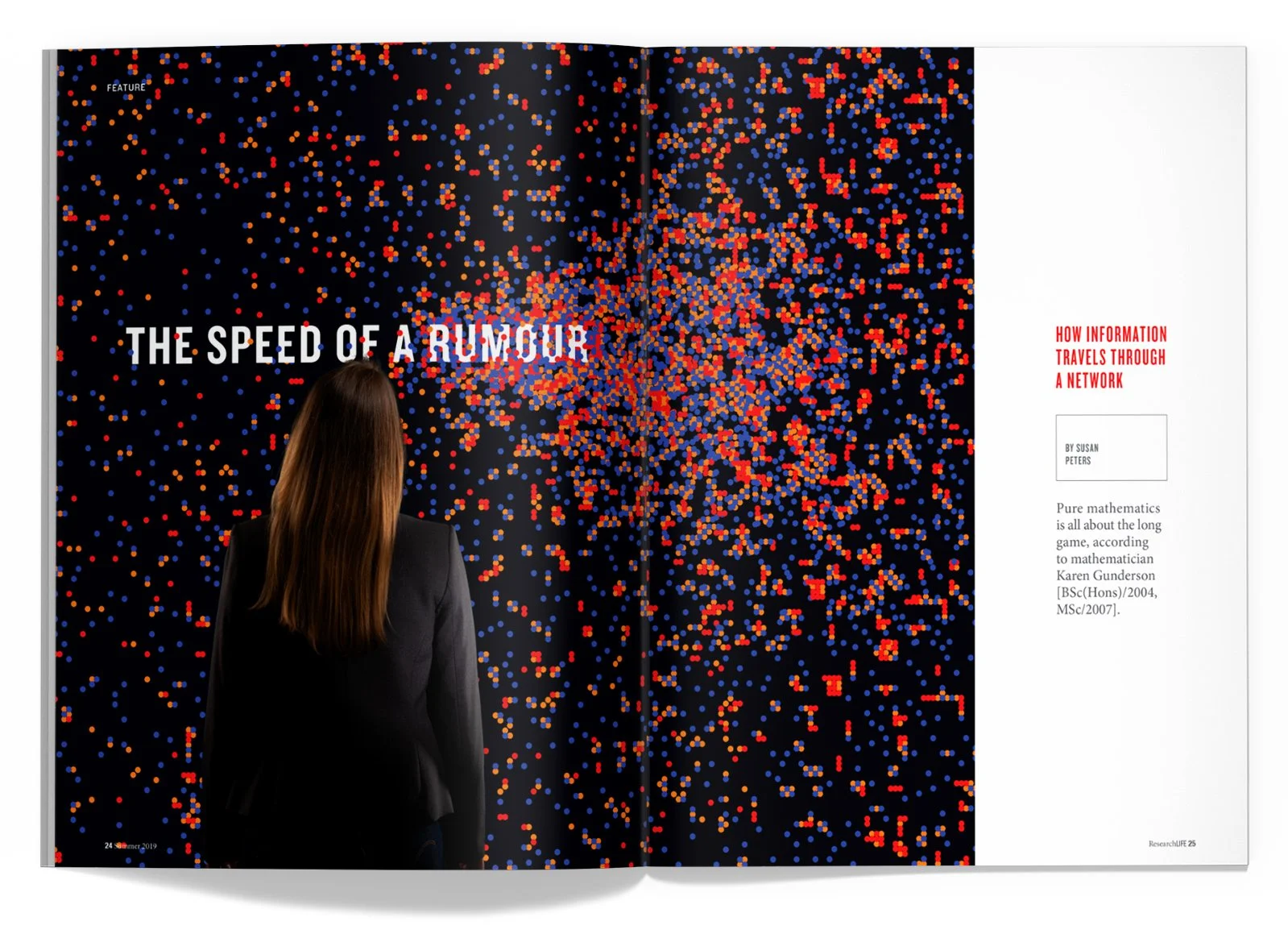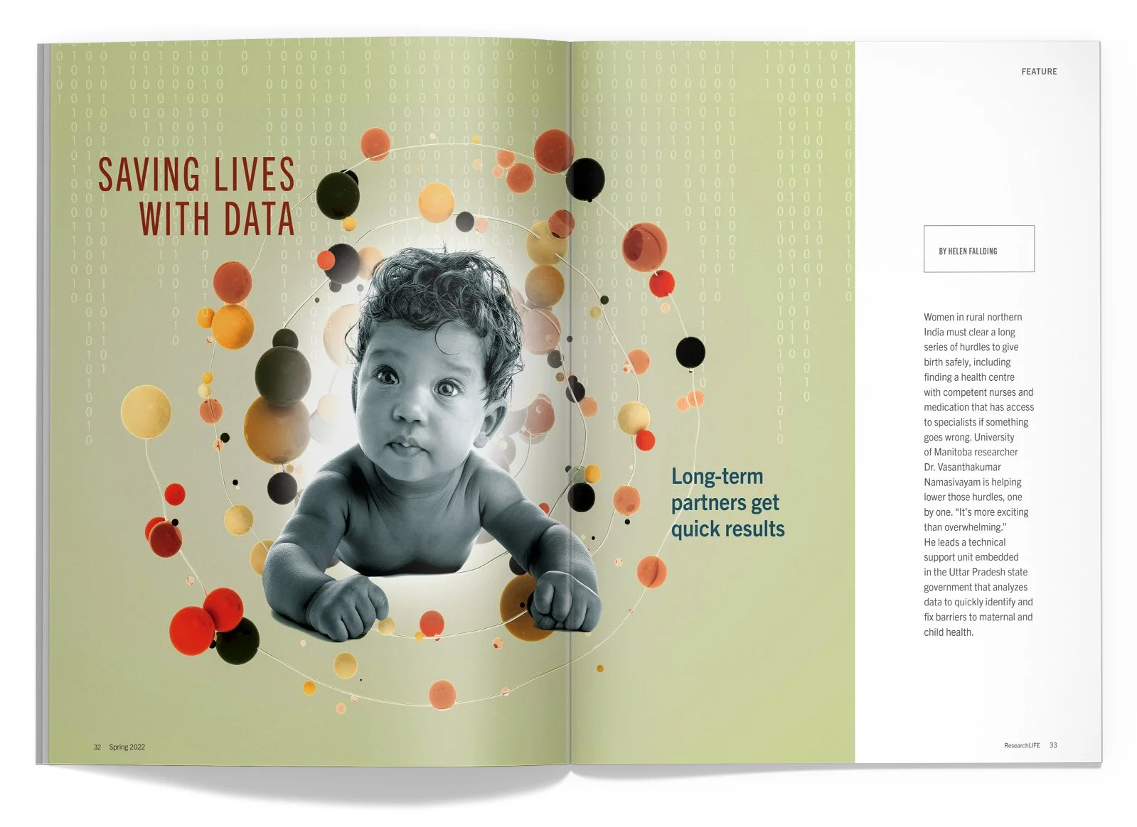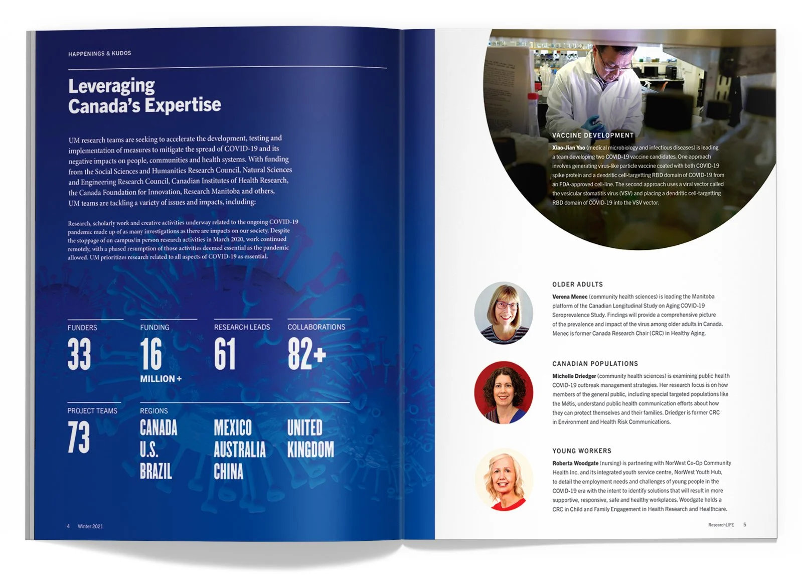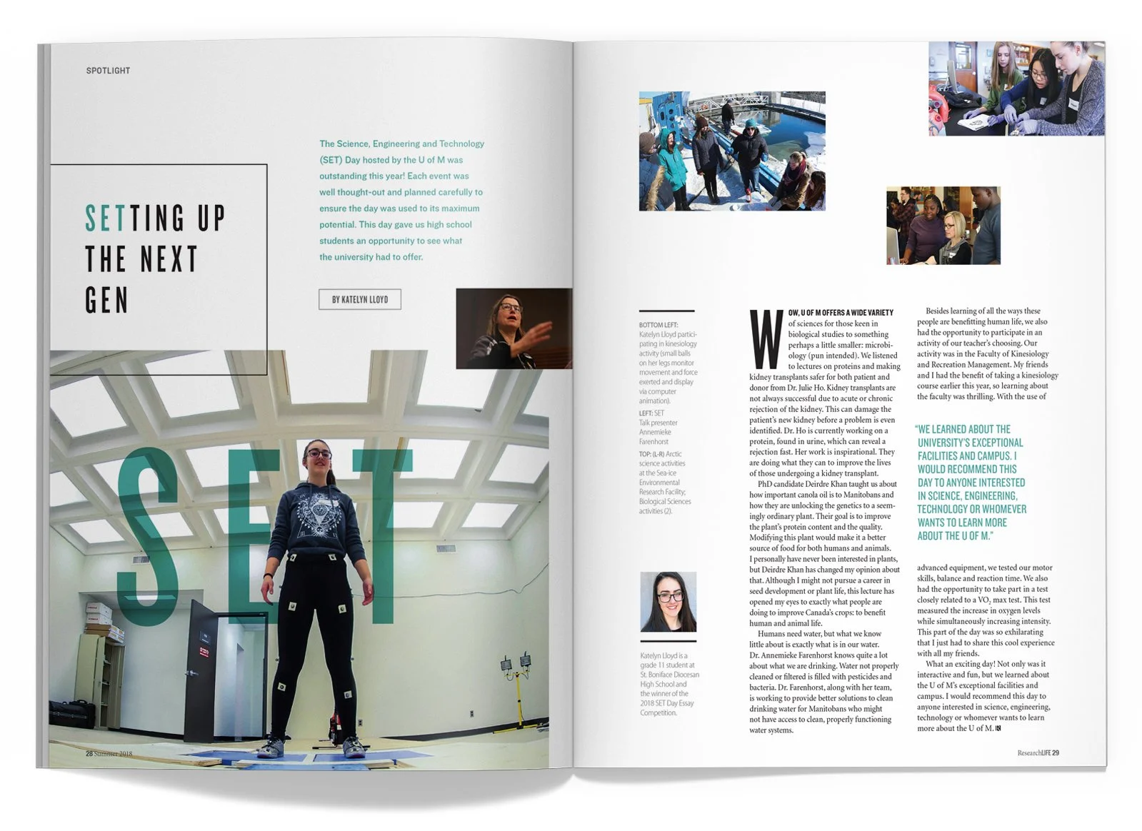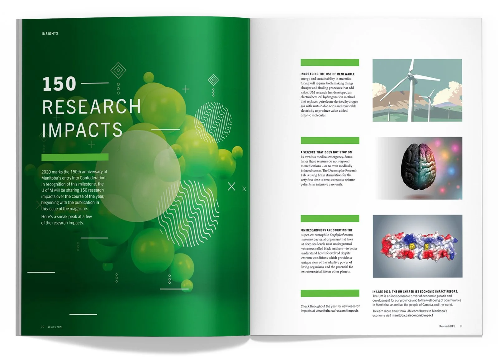 The magazine redesign was intended to give the magazine a modern, cohesive design to reflect the sophistication and diversity of its readers, which includes academic researchers, students and other professionals in a broad range of disciplines. A standardized font and colour palette was developed in keeping with the overall U of M brand. The feature articles are designed to stand out through the use of original photography, custom title typography and compelling illustrations in a creative and conceptual manner to reflect each story.